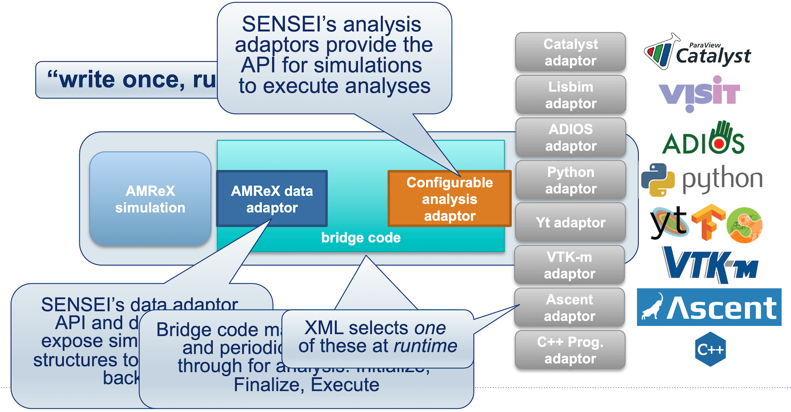 The universal in-situ interface provided by SENSEI (Scalable Environment for Novel Exploration of Impactful Simulations) enables simulation data producers to communicate with generic in-situ analysis and visualization endpoints through a unified API. This approach allows multiple endpoints (and of multiple types – not just Catalyst2) to be combined within a single simulation, offering flexibility in how data is processed and analyzed at runtime.