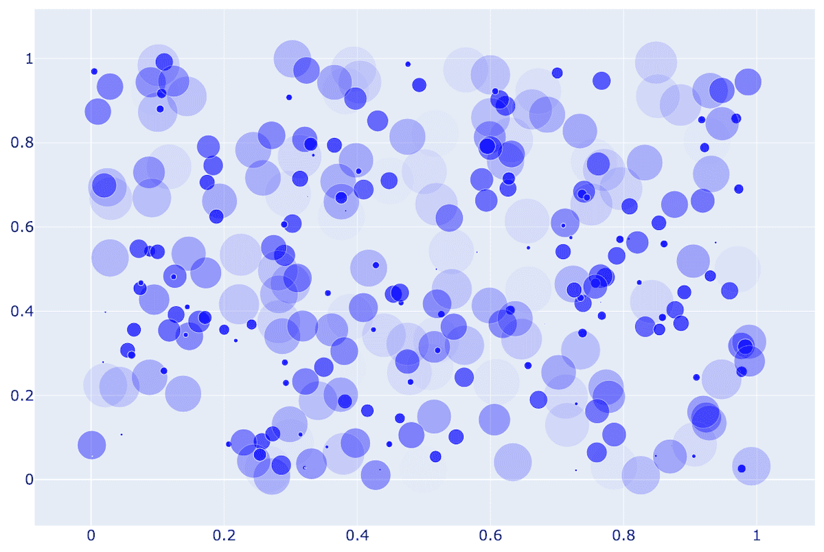 Create a scatter plot of 300 random filled blue circles inside a unit square. Their random opacity must anti-correlate with their size (bigger circles should be more transparent) – see the plot below.