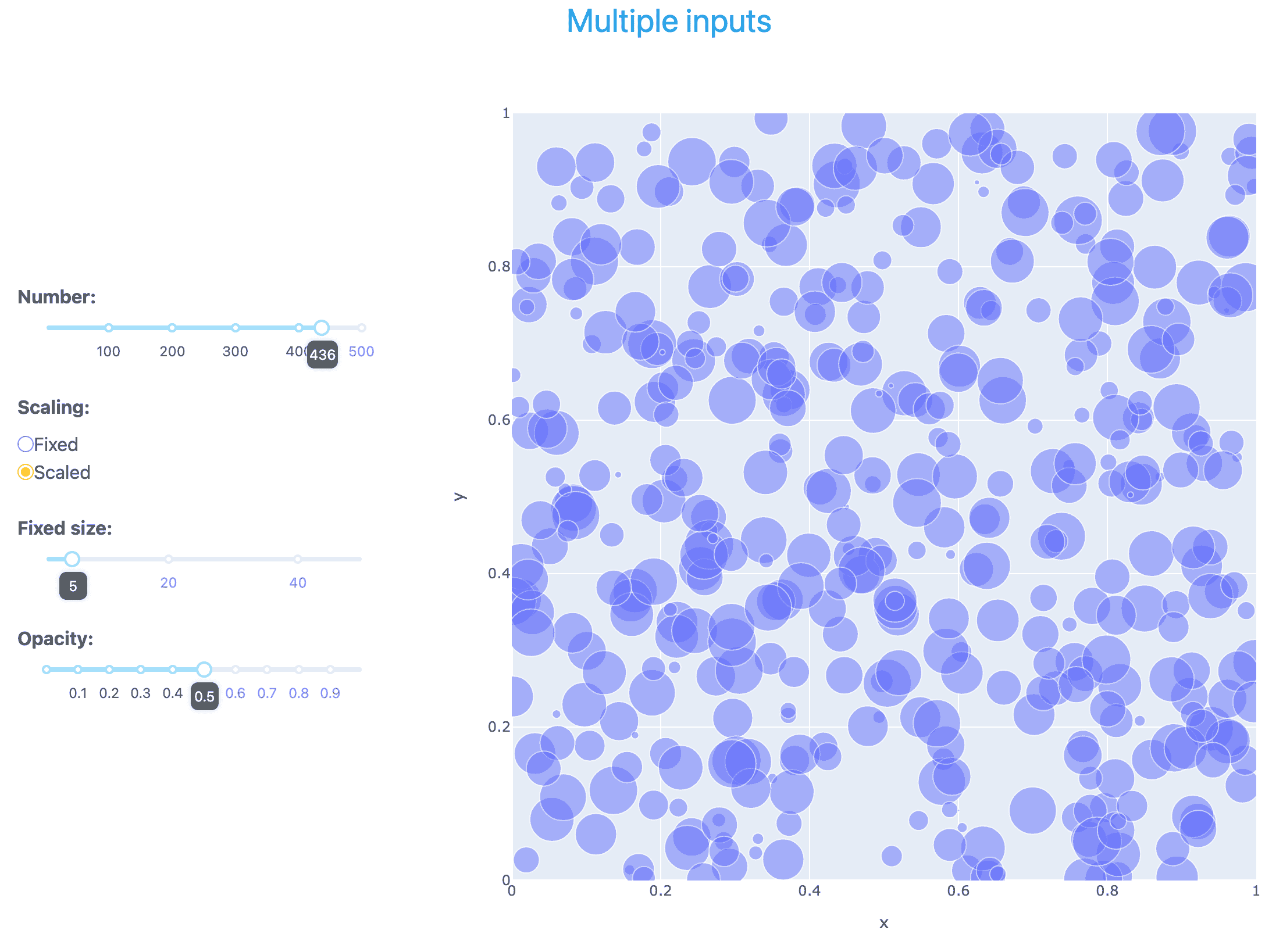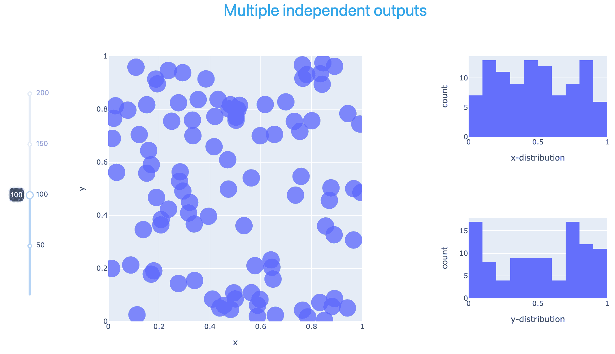 Now we go back to a single, vertical slider for the number of points, and add two histogram plots showing the distribution of all points in the scatter plot along the x- and y-axis, respectively. The slider affects all three plots – and this is the only connection between the plots. For example, if you zoom in on an area in the scatter plot, the histogram plots will not change.
