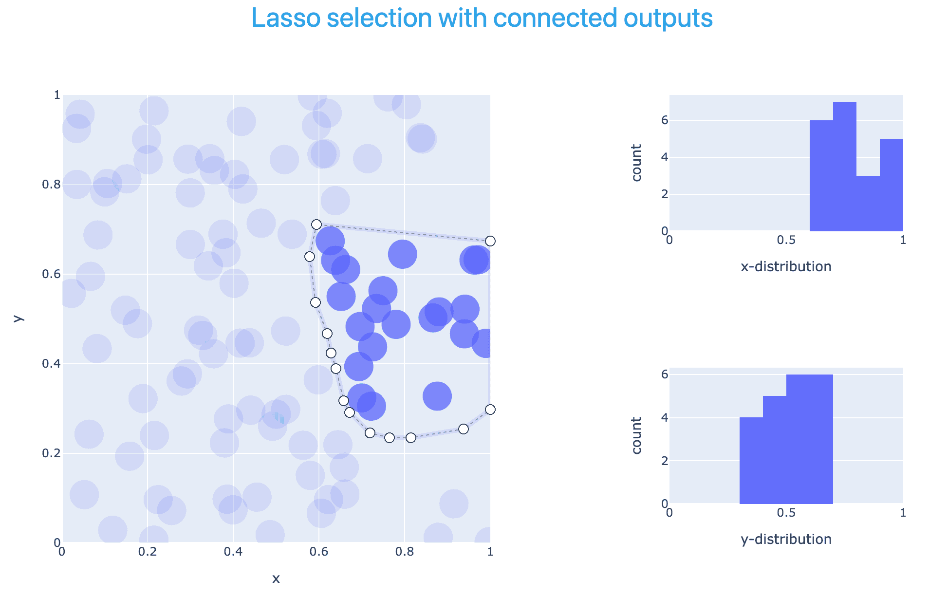 Let’s remove the slider, and add a Lasso selection in the scatter plot and show the x- and y-histograms only for the points selected with Lasso. If there is no selection, add a text “Select points to see details” to the histograms.